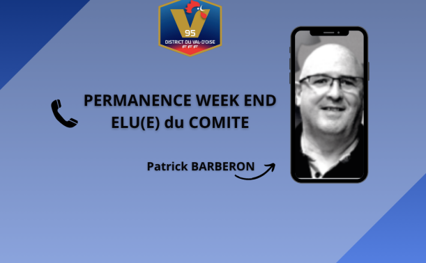 Patrick BARBERON est à votre écoute au 01 34 08 11 28 de vendredi 18h00 à dimanche 19h00 Nous vous rappelons que cette ligne est réservée exclusivement le WE aux problèmes traitant que les points suivants : Absence arbitre Absence d’équipe (forfait, incident durant le trajet…) Terrain i...