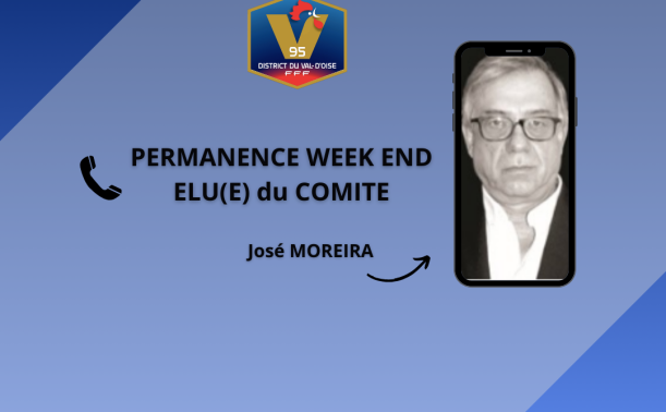José MOREIRA est à votre écoute au 01 34 08 11 28 de vendredi 18h00 à dimanche 19h00 Nous vous rappelons que cette ligne est réservée exclusivement le WE aux problèmes traitant que les points suivants : Absence arbitre Absence d’équipe (forfait, incident durant le trajet…) Terrain impra...