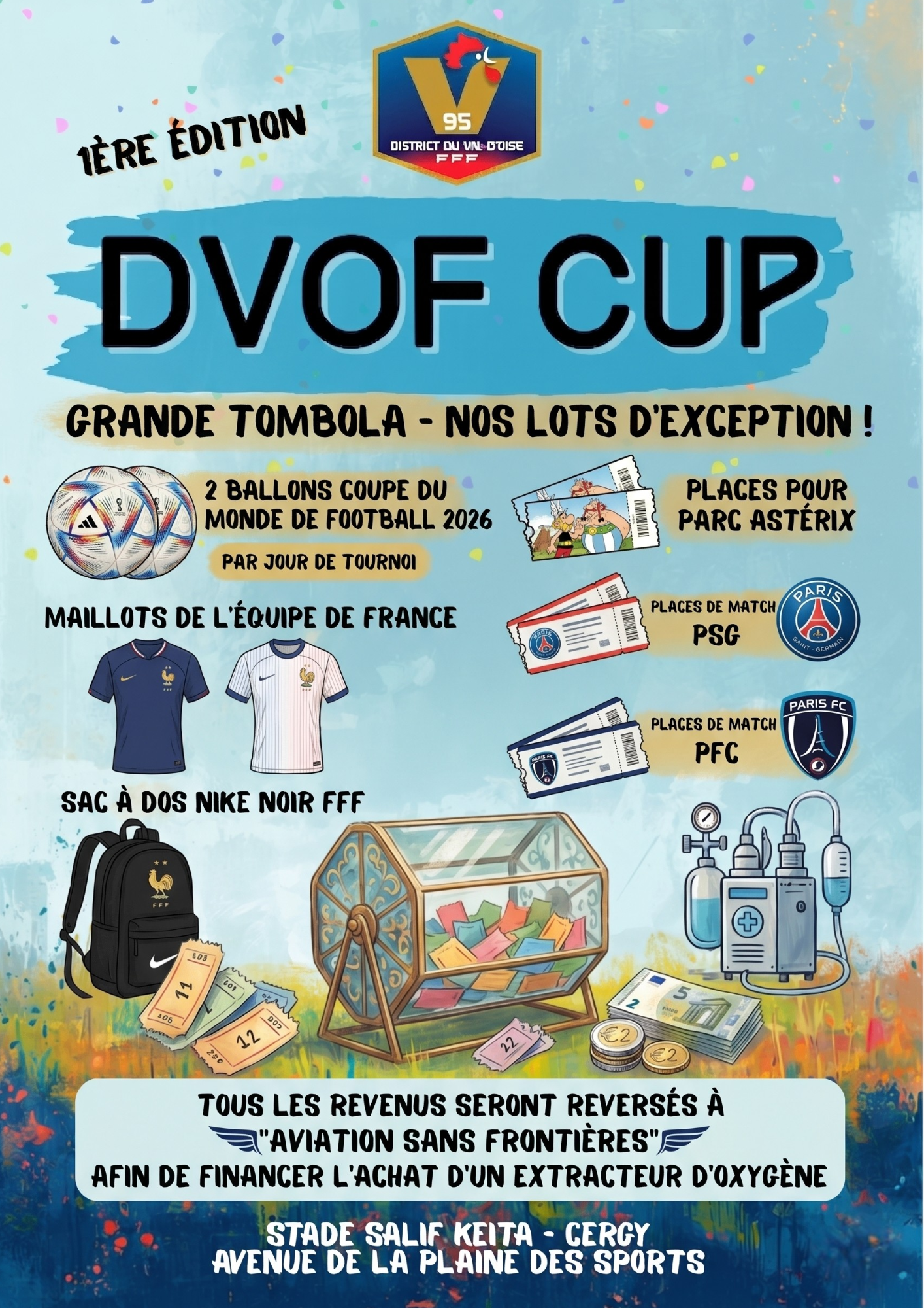 Dans le cadre de la DVOF Cup organisée ce week-end à Cergy, le District du Val-d’Oise de Football met en place une tombola solidaire au profit de l’association Aviation Sans Frontières.